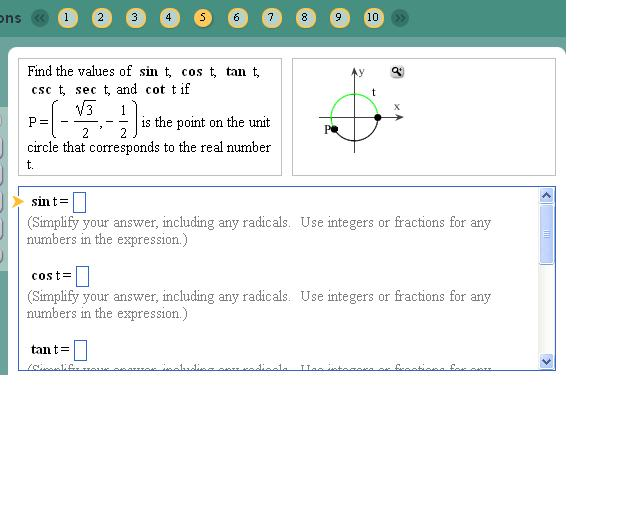 Find the values of sin t cos t tan t csc t sec t an cot t if P -32 12 is the point on the unit circle that corresponds to the real number t.